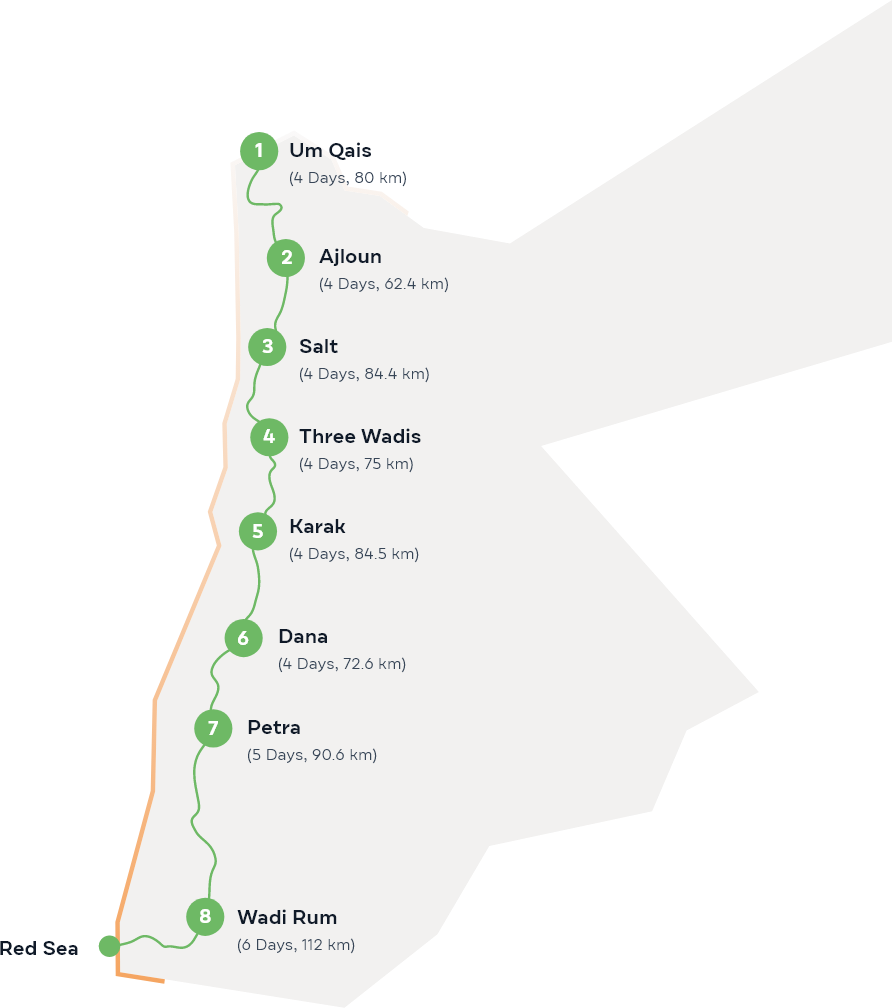 "The Jordan Trail is a long distance hiking trail in Jordan connecting the length of Jordan from Um Qais in the north to Aqaba in the south. Offering 40 days of hiking over more than 650 kilometers of trail, and travelling through 52 villages and towns on its way. The trail traverses the diverse landscapes and vistas of the country, from the rolling wooded hills of the north, the rugged wadis and cliffs overlooking the Jordan Rift Valley, the rose rock city of Petra, the dramatic sands and towering mountains in Wadi Rum, to the crystal waters of the Red Sea.